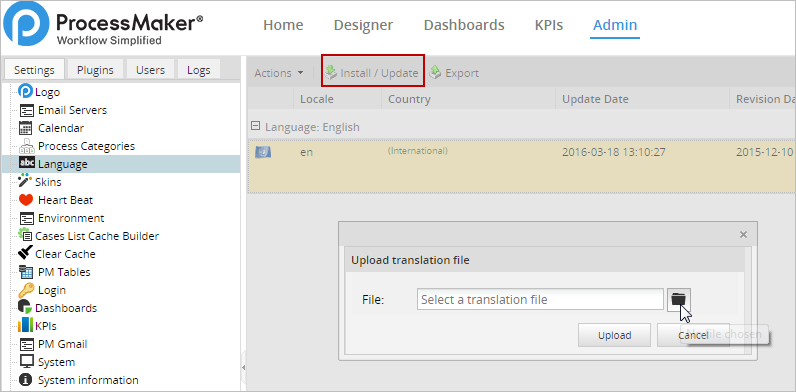 To add a new translation, log in to ProcessMaker as the admin user (or any other user with PM_SETUP_ADVANCE in their role), go to ADMIN > Settings > LANGUAGES and click on Install/Update. A window will open. Click on the folder icon to search for the .po file in the local computer.