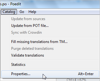 First edit the header information for the PO file. Go to Catalog > Properties or press Alt+Enter: