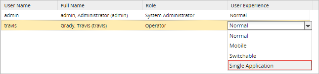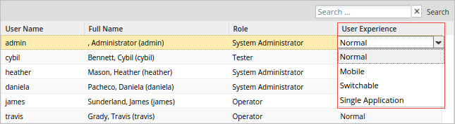 To change a user's interface, click on a user in the User Experience column. Then select an option in the dropdown box that appears: