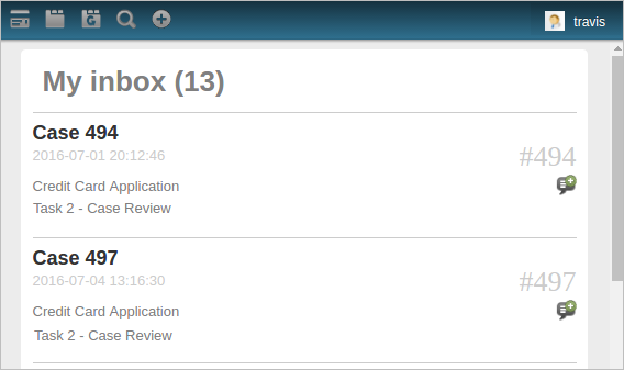 Shows all the incoming cases. This is useful because users can choose to only see cases that require further action. By clicking on the name of the Dynaform, the next step will be displayed allowing users to continue the case.