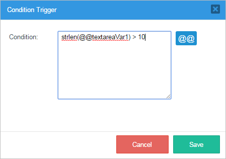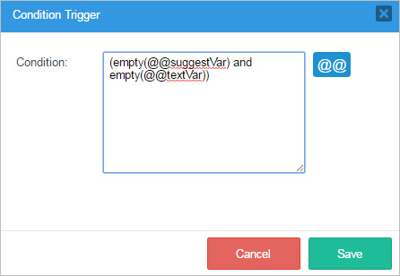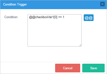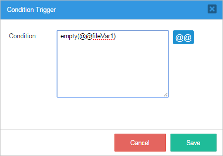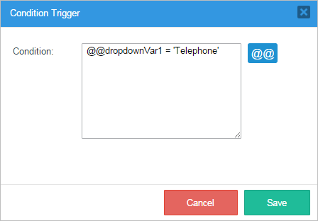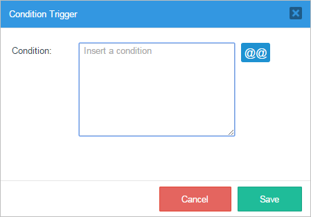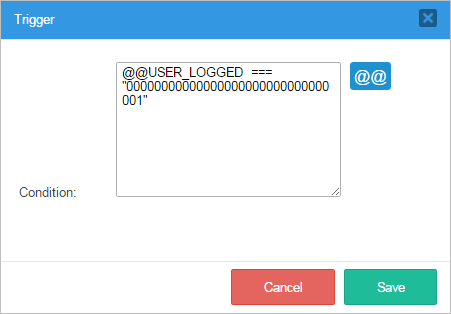 When the "Condition Trigger" window is opened observe that there is a section where a condition for the execution of the trigger can be added. This condition will work as an IF for the trigger's execution. Notice also that case and system variables can be added by clicking on the "@@" button.