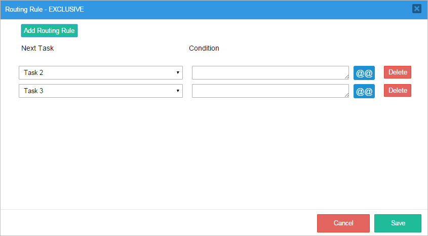 A condition can be set for each path. If the condition evaluates to True then the next task will be executed. If False then the next task (and any subsequent tasks on the same path) will not be executed. If the condition on a routing rule is left blank, then the condition will be considered True and the next task in the path will be executed.