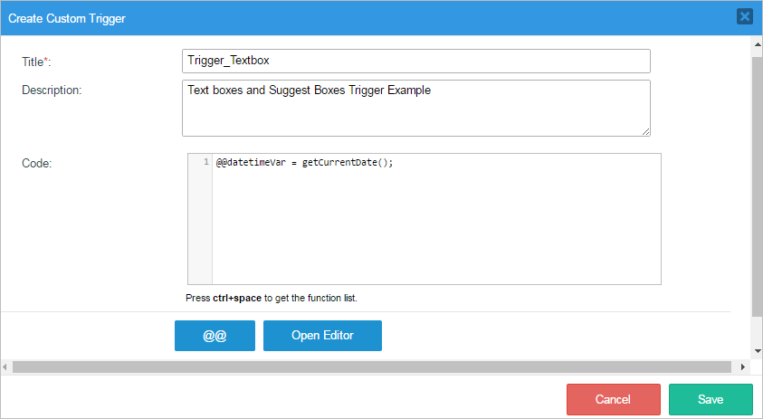 In the Create Custom Trigger window, place the following code inside the Code box.