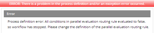 If all of the conditions for an exclusive or inclusive gateway evaluate to false and there is no available default flow, then the process stops and the following error message appears: