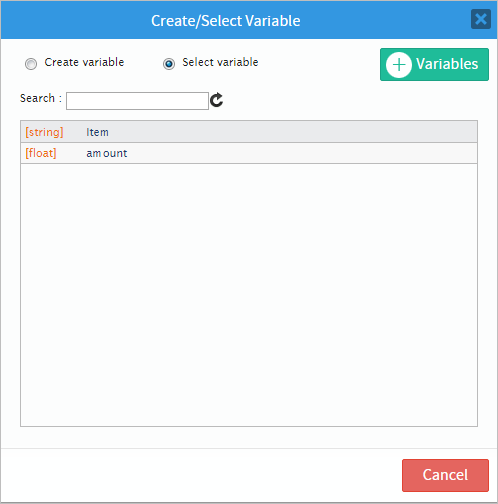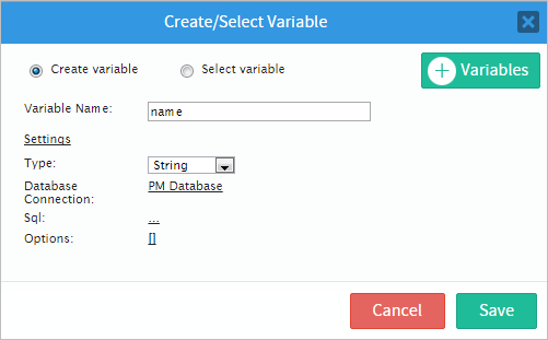 This new window will have two radio buttons offering two options which are: "Create variable" (creates a variable directly from this window) or "Select variable" (selects an existing process variable).