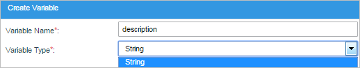 - String Accepts characters of any type, including letters, numbers, symbols and spaces. String variables can be used to populate textboxes, textareas, suggest boxes, dropdown boxes, radio buttons and hidden fields. For example, a string variable can be used to store a description: