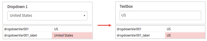 The variable value is "US" and its _label variable is "United States" in the dropdown of a first Dynaform. Once the case is routed to a second Dynaform, when the variable is assigned to a textbox, only the variable value ("US") will be displayed in the textbox. Once this textbox is submitted, the _label variable will change from "United States" to "US", because a textbox stores the same value in the variable value and its _label.