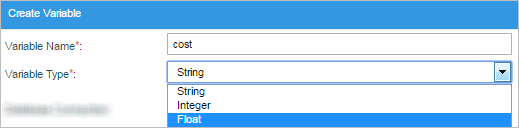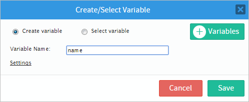 The "Create variable" option will allow the immediate creation of a variable by firstly adding a "Variable Name", for this example the variable will be "name".