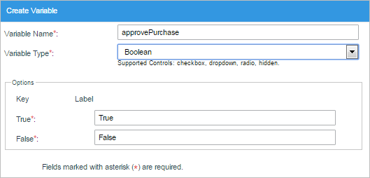Boolean variables have options for the TRUE and FALSE keys. The label for each of these keys can be configured. Boolean variables can only be used with dropdown box, radio button and checkbox controls in DynaForms.