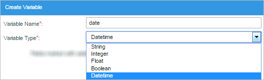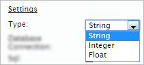 The "Type" setting is a dropdown which allows to choose the type of variable that will be used.This depends solely on the control chosen so the type of variable will change. In case is a "Textbox" control (like in the example below) the type of variable available will be "String", "Float" and "Integer". Try adding a "Datetime" control and the type of variable available will be only "datetime".