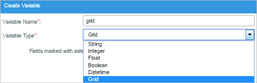 - Grid: This type of variable is used to store Grid controls in DynaForms. ProcessMaker stores grids as a numbered array of associative arrays, which is the same format used when storing the results of database queries, so that grids can be populated with a database query.