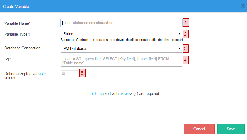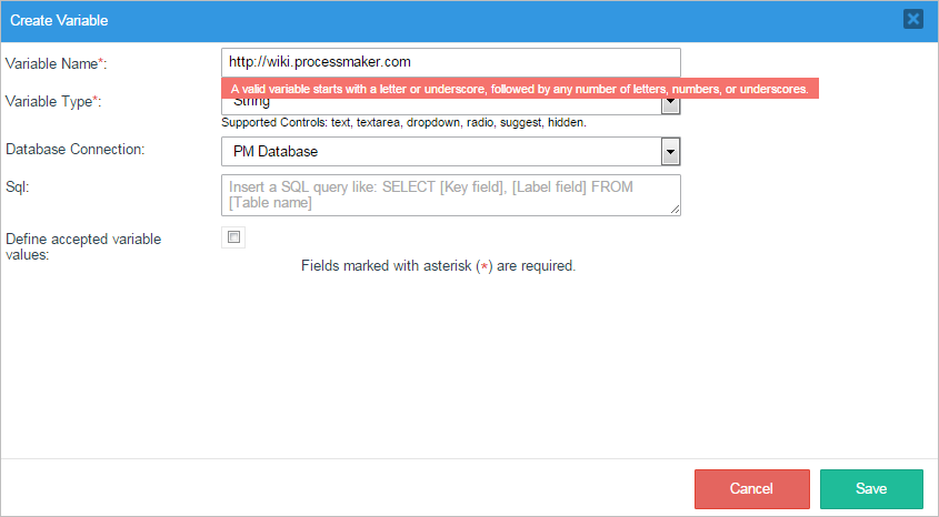 ^[a-zA-Z_\x7f-\xff][a-zA-Z0-9_\x7f-\xff]* - Variable Type: Required. Select the data type of the new variable. The data types supported by ProcessMaker version 3 are:
