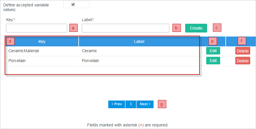 - d. List of the options already added to the variable. In this list the key (value) of the option and its label are shown.