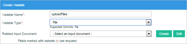 - File: Variable to store the file(s) selected in a file control. An Input Document can also be associated with a file variable. When defining an Input Document, a file variable can be selected to hold its contents, so that the Input Document can be accessed through a file control in a DynaForm or as a variable in a Trigger. Define the maximum file size, the destination path and allowed file extensions of the uploaded files in the Input Document. The file variable can then be associated with an existing Input Document.