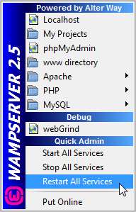 After saving all files, restart WAMPServer by clicking on the WampServer logo and choosing "Restart all services"