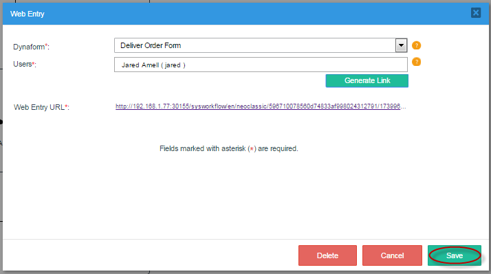 Generate the Web Entry by clicking on the button marked as "Generate Link". This link can be used to access the Dynaform added in the Start Event.