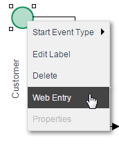 To create a "Web Entry", first create a Start Event. Then, right click on that Start Event and select "Web Entry" from the context menu that appears (see image below) and a new window will open.