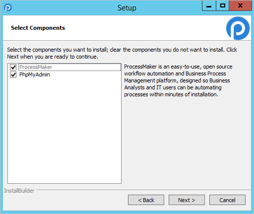 In the next screen, select the components that will be installed. By default, ProcessMaker is marked but the installation of phpMyAdmin to handle the administration of MySQL is optional.