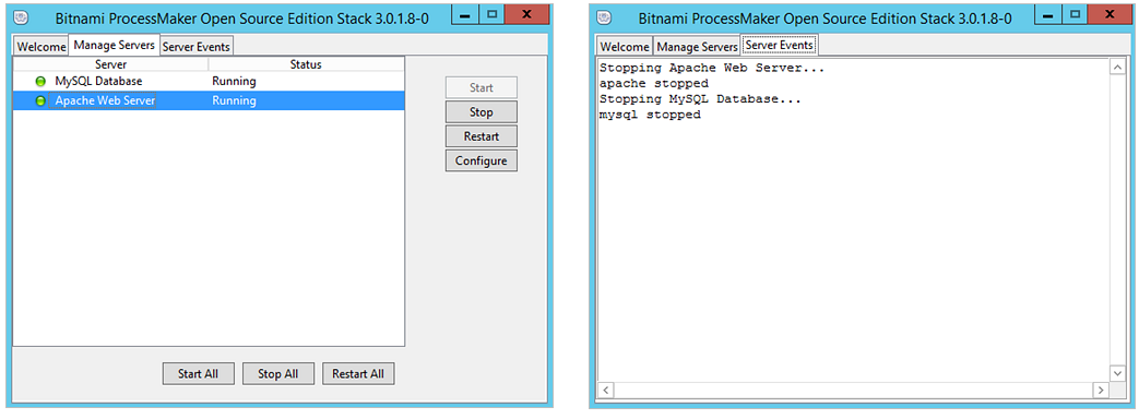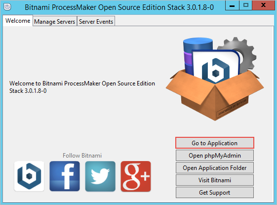 Once the installation process has finished, the Bitnami ProcessMaker Stack Manager Tool will be available to manage the Apache and MySQL easily. To access ProcessMaker, navigate to the Welcome tab and click on the Go to Application button.