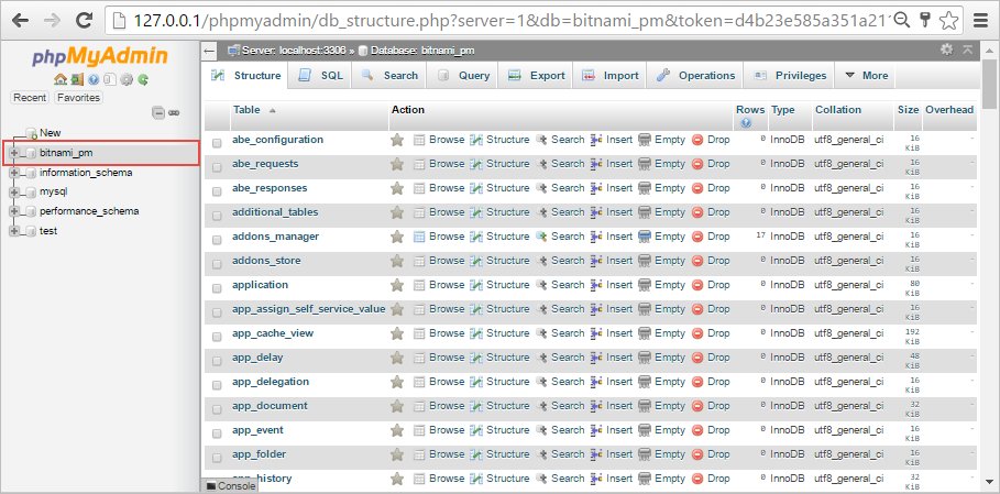 Once logged in, the interface of phpMyAdmin will be displayed. The ProcessMaker database created by bitnami is named by default bitnami_pm. Select the bitname_pm database to review all the ProcessMaker tables.