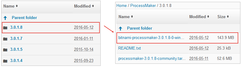 Download the .exe installer at ProcessMaker's SourceForge page. ProcessMaker versions are labeled according to its build number. To download the latest version of ProcessMaker, look for the highest version number. Remember that the Bitnami ProcessMaker Installer is only available from ProcessMaker version 3.0.1.8 on.
