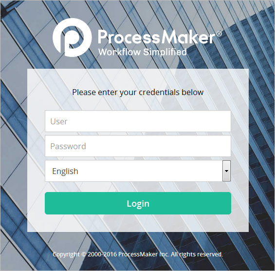 Then, enter the name and password of the Administrator user which by default is "admin", but a different username could have been configured in Step 4 of the Installation Wizard. Enter the name of the workspace which was configured in Step 4, which by default is named "workflow", Then click on Login to enter processmaker.