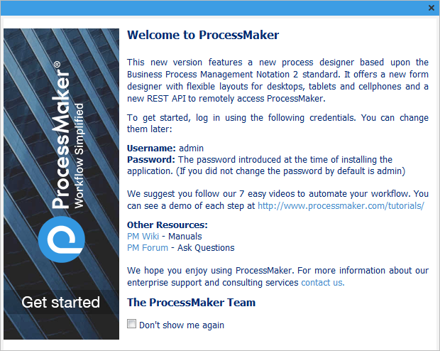 Once ProcessMaker has been successfully installed, the web browser will be redirected to the login page. The Get Started screen will appear: