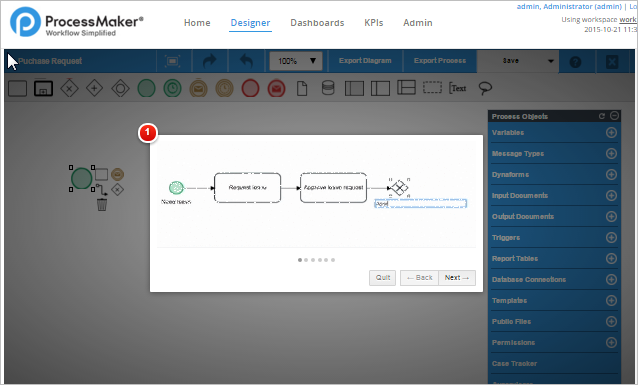 After watching the demo, click on Quit to close the window and access the process map. The process map is the canvas that offers a dynamic visual representation of the tasks and the BPMN elements associated with a business process. The first element in the process, a Start Event, will already be placed in the process.