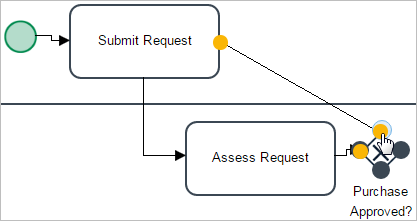 Click on the task "Assess Request" to access its Quick Toolbar. Grab the gateway and drop it next to the task in the "Supervisor" lane, then double click on its label to name it "Purchase Approved?".