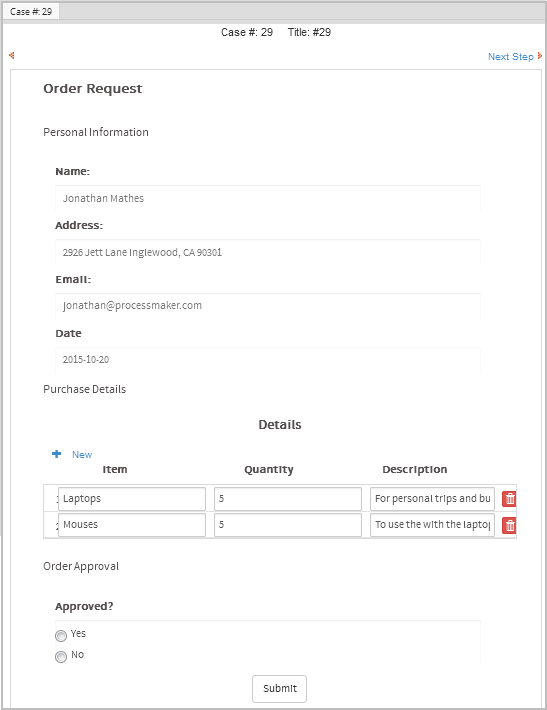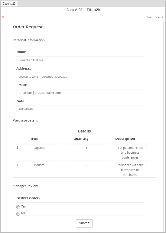 After filling out the "Order Request" form, click on its Submit button to save the information to the ProcessMaker server. The next step in the task is the assignment of a users in the Supervisor group to the next task.
