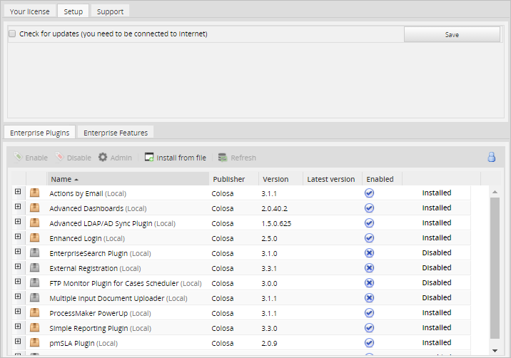 ProcessMaker can be configured to automatically check for updated versions of plugins and features as they become available. To enable this option, go to ADMIN > Plugins > Enterprise Manager > Setup and mark the Check for updates option. Remember that the ProcessMaker server must have an internet connection in order to check for updates.