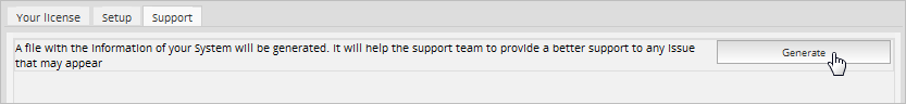 The Enterprise Manager provides an option to generate a file providing information about your system, which can be sent to the ProcessMaker Support Team in order to check for issues related to the license, plugins and/or features. To create this file, go to ADMIN > Plugins > Enterprise Manager > Support and click on the Generate button to download the file to your computer.