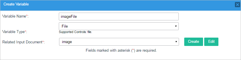 2. Create a new variable whose name is "imageFile" and whose type is "File". Associate this variable with the Input Document that was just created.
