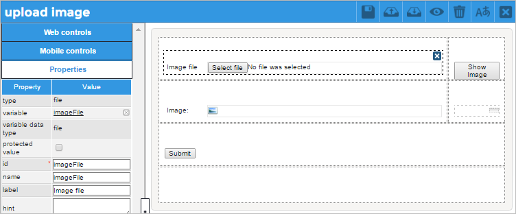 Trigger code can be used to look up an image file which was uploaded to a File control or an Input Document and construct the URL to display it in an Image control. In this example, a DynaForm has a File control and Image control below it. If the user uploads a file, then the image will be displayed below in the DynaForm.