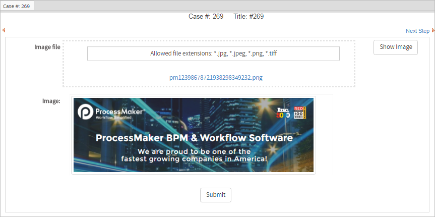 - Finally, the trigger calls the PMFRedirectToStep to redirect back to the DynaForm and display the image of the uploaded file.