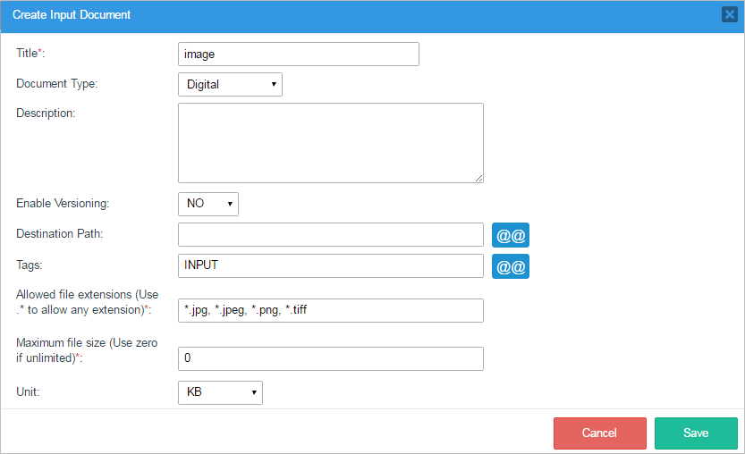 1. Create an Input Document, whose Allowed file extensions is set to *.jpg, *.jpeg, *.png, *.tiff so it will only accept image files.