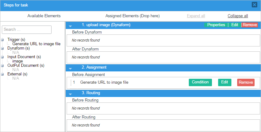 Set this trigger to fire before the step that follows the DynaForm or before assignment if the DynaForm is the last step in its task. In this example, the DynaForm is the only step, therefore the trigger will be placed before assignment.