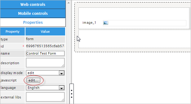 To do so, click on the light grey border of the DynaForm (which is the space outside the controls) to display the properties of the DynaForm. When the properties are displayed locate the "javascript" property and click on the "edit" button to open an editor.