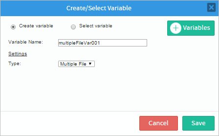 The options available in the setting change depending on the type of control. For example, the multiplefile control only has one setting: "Type". The Type setting has only one option, "Multiple File". To learn how to assign an Input Document, read this documentation. Then in the Create Variable window, click on the Save button to finish this configuration.