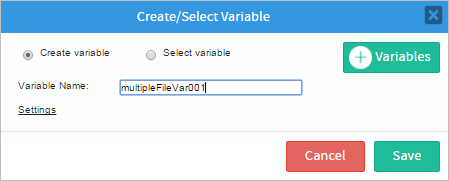 Immediately after adding the control, the Create Variable window will appear. A variable can be created in this window, or can be selected from the existing process variables. A variable can also be created by clicking on the Variables button. A new variable will need to be created for this example, so stay in the Create/Select Variable window. Even though the variable name can be edited, keep it as "multipleFileVar001". Click on the underlined Settings option to display more variable configurations.