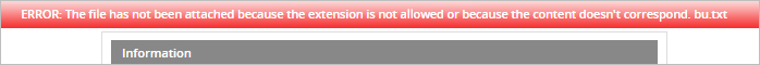If a file with a different extension is attached, a validation error message is shown. Notice that even if a file is modified to have the allowed file extension, the multiple file control will check the real file type and will display the following message if the file is not allowed.