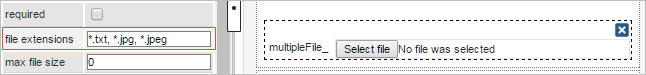 The File extensions property defines the allowed extensions of the files that can be uploaded in the Multiple File Uploader field: