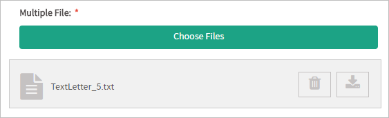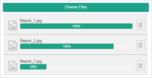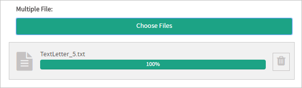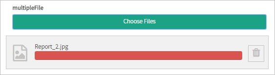 The Multiple File control, which was added in version 3.1, allows more than one file to be uploaded and attached to the current case. To select and upload files, click on the Choose Files button of the control. The dialog box to select the files will vary according to browser. After being selected, the file will be listed below the field. The upload process is immediate, meaning that as soon as the user selects the file, a progress bar will show the percentage of the upload completed. It will turn green to indicate that the file has been completely uploaded to the ProcesssMaker server. This makes it possible to save time when submitting the form. The icon of this control in the toolbar of the designer is the following: