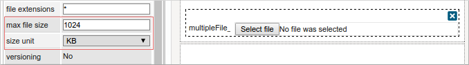 | File extensions | Set the allowed file extensions in this property. Use a comma to separate all the extensions that will be enabled for the control. For example “ If this property is not defined, then any file extension is allowed. |