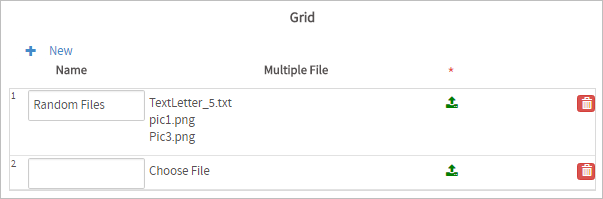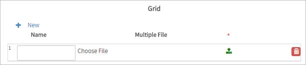 The Multiple File Uploader control has a different appearance in grids. To upload a file, click on the green