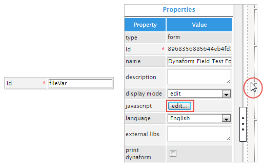The ID property can be used with JavaScript code. To add JavaScript to the ID property, click on the light grey border of the Dynaform (which is the space outside of the control fields) to display the Dynaform properties. When the properties are displayed, locate the javascript property and click on the edit... button to open the JavaScript editor.