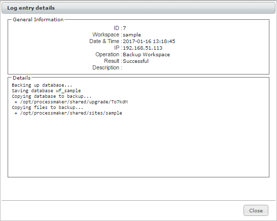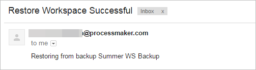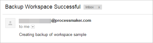 Therefore, make sure that the server where ProcessMaker is installed is configured to execute this file periodically, either as a cron job in Linux/UNIX servers or as a Scheduled Task in Windows servers. Moreover, the user who configures the backup, restore, clone or delete workspaces operations will receive an email notification indicating that these operations were completed successfully.