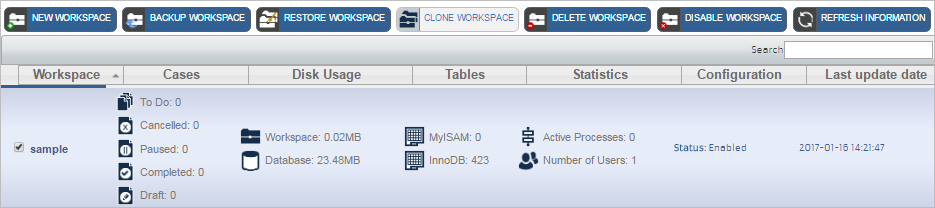Some of these actions will be executed when the user clicks on the option in the Multitenant Management interface, but the options to backup, restore or clone a workspace are not executed in real time. Instead, they are set as pending actions that will be executed when the multitenant cron file named mttCron.php is executed.