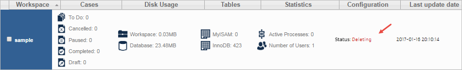 Delete a workspace. Do not forget that to complete the deleting process, the mttCron.php must be executed.