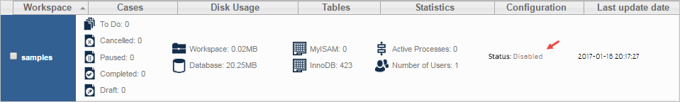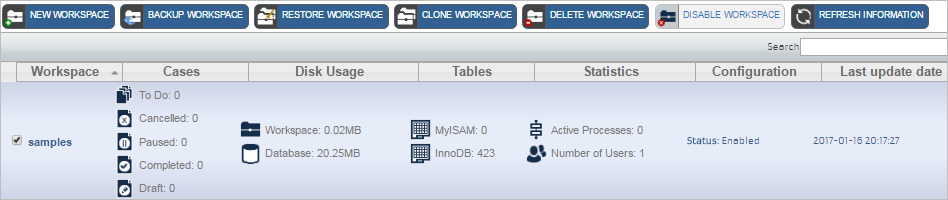 • Configuration: Shows the current status of the workspace: “enabled” or “disabled”.
